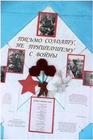 Ребята принимают активное участие в акции, пишут трогательные письма солдатам, не вернувшимся с войны. Письма ребята пишут и в стихах и в прозе. В своих письмах ребята искренне благодарят героев ВОВ за мирное небо над нашими головами. Лучшие работы попадают на стенд: